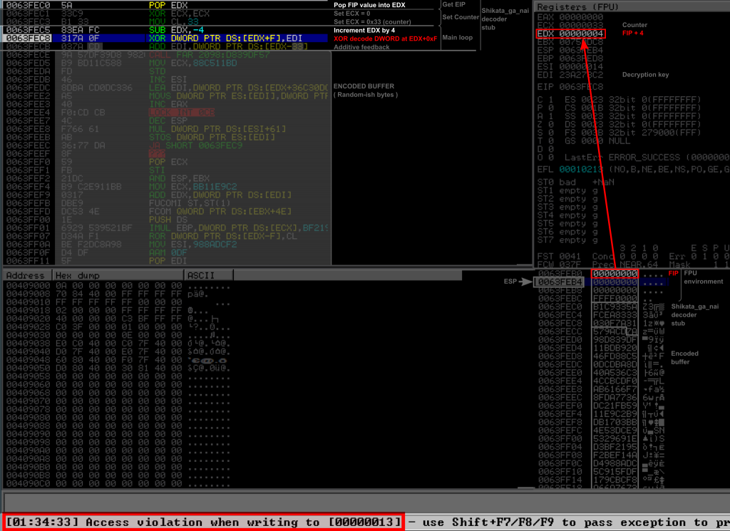 To come back to the buffer overflow exploit development, the important point for you is that if you get an access violation at the XOR instruction and involving a very low value address, then you certainly are running into this problem. At this point there is a good chance your exploit is actually working, so just try it without the debugger. If you still want to debug your shellcode or decoder, you can just manually edit the stack after the FSTENV