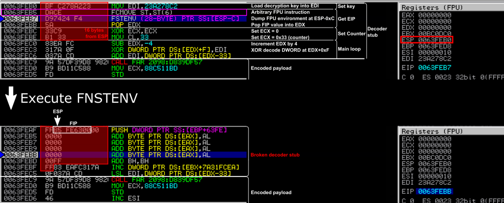 instruction. This instruction dumped the “FPU environment” to a specified memory location, here at ESP - 0xC