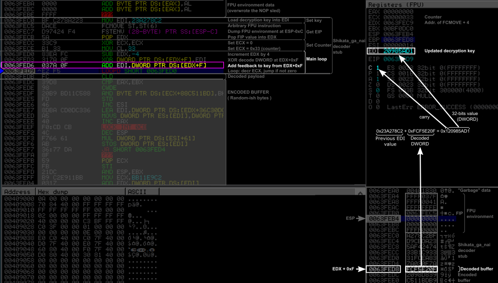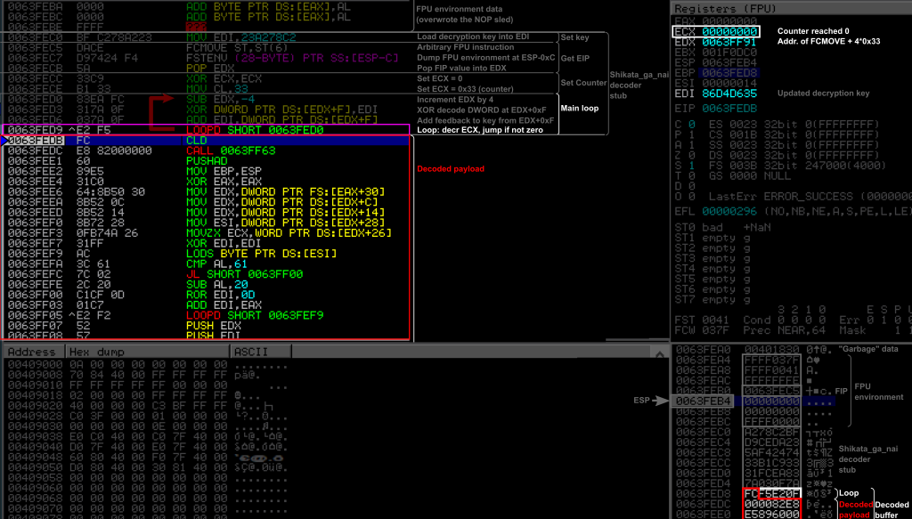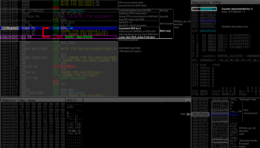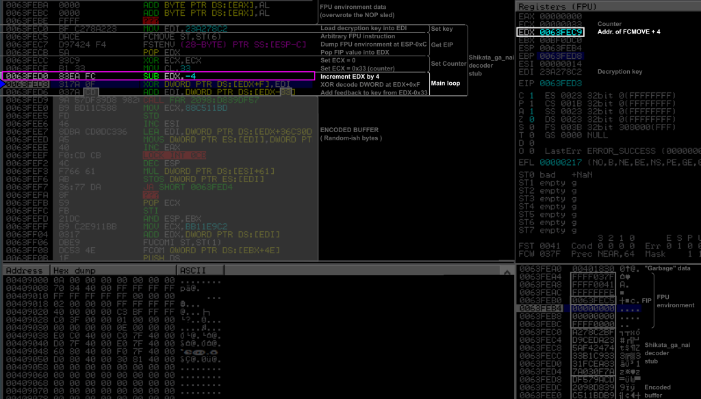 Compared to the decoder we studied in the first part of this article, we can notice that this time the key is loaded into ESI and it is done between the two FPU instructions, the pointer to FIP is stored into EBX. In the main loop, the FIP pointer is incremented after the XOR