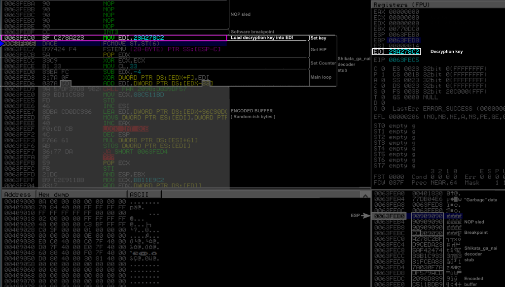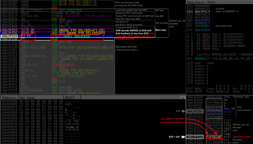 where starts the SGN decoder stub. This decoder begins with the three initialization blocks (Load encryption key, get EIP, setup counter) followed by the main loop. The encoded buffer is just attached to the end of the decoder stub, and starts at 0x0063FED8