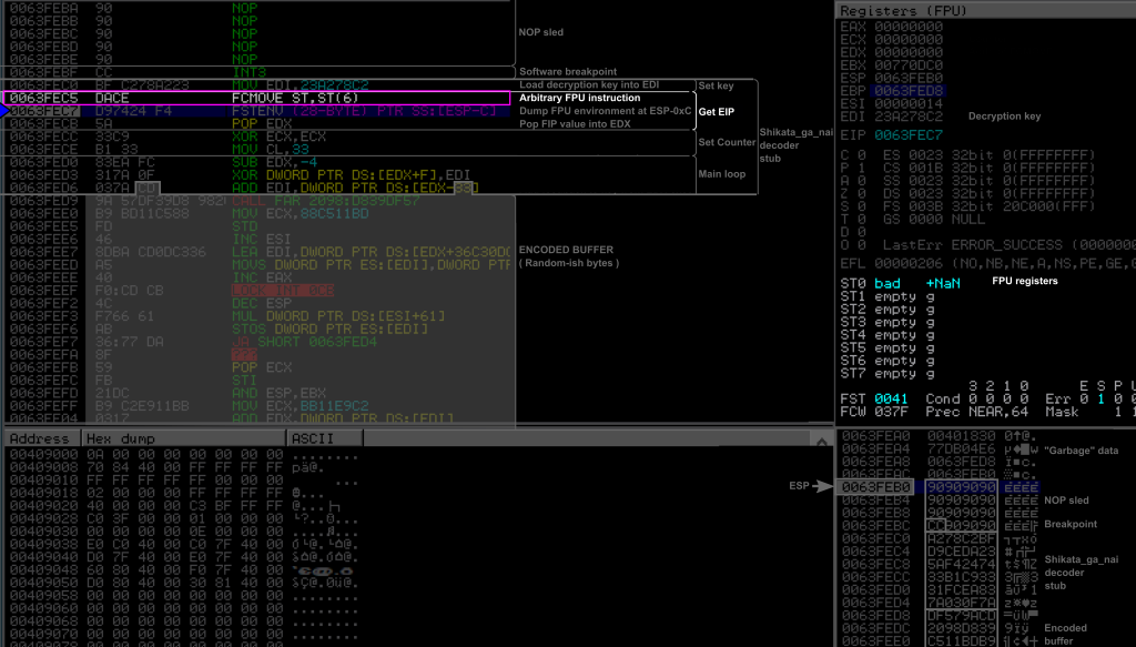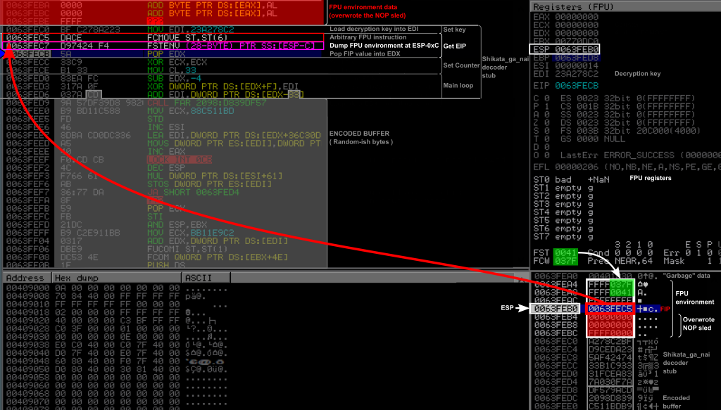 , as highlighted by a white square on the figure (bottom right panel). We can indeed see that the FPU environment on the stack starts with the values from the FST and FCW registers of the FPU (FPU Status and Control Words respectively), highlighted in green. Note also that this overwrote our NOP sled and our software breakpoint (highlighted in red) as can be seen from the stack (bottom right panel) as well as on the instruction listing (top left panel). This may give you a hint about why you need a NOP sled…