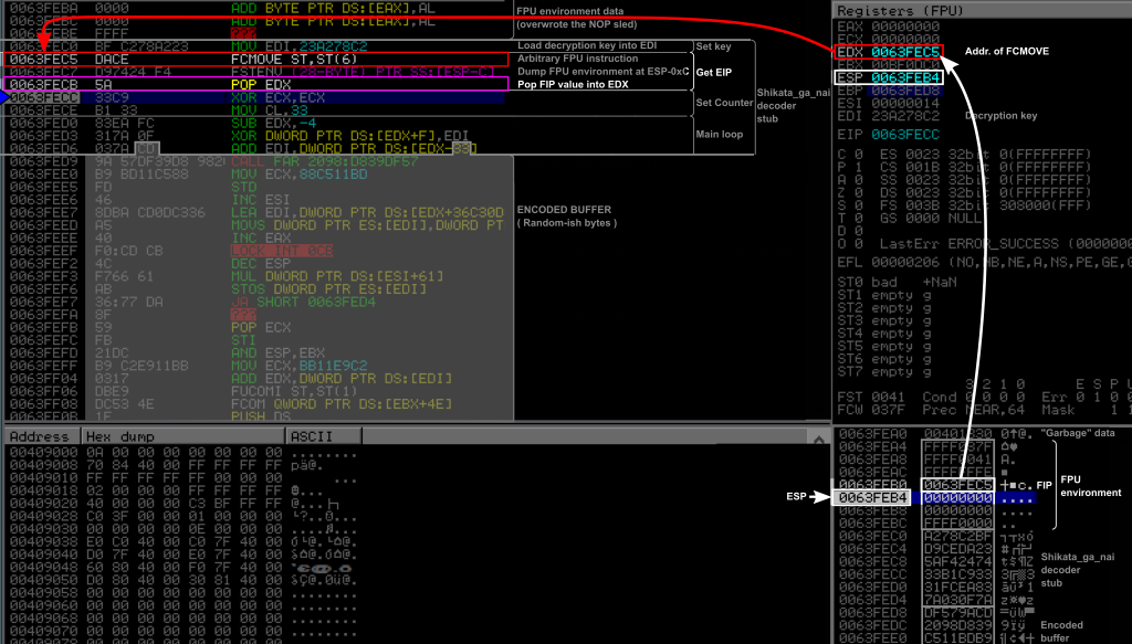 . It is a conditional move between the FPU internal registers ST and ST6. If we take a look at the registers (top right panel), we can indeed see that this instruction modified the FPU registers (ST0, and FST) in the bottom. But it doesn’t actually matter what this instruction does, the important thing is that the address of this instruction was stored in the FIP register of the FPU (even though FIP is not shown in the debugger).