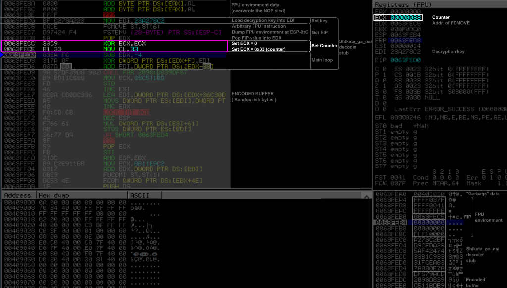 I will discuss more about the implications of the additive feedback and about the polymorphism at the end of this article. Let’s now dissect Shikata_ga_nai.