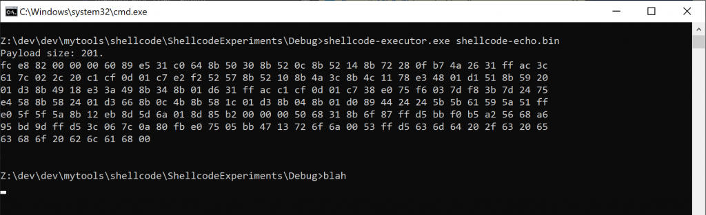 As an example, let’s try to write a shellcode that would build our command line cmd /c echo blah